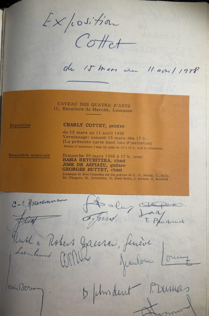 Lorsqu’Evelyne Knecht, fille de Willy vint repérer les lieux, elle me montra d’abord une porte… puis, le grand livre d’or des 4 Z’Arts remplis de coupures de presse, de signatures, de listes des artistes et œuvres exposées…